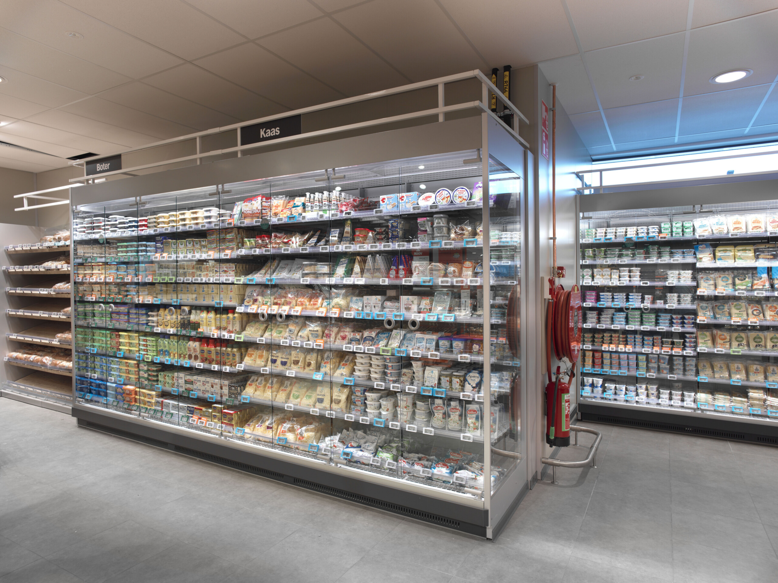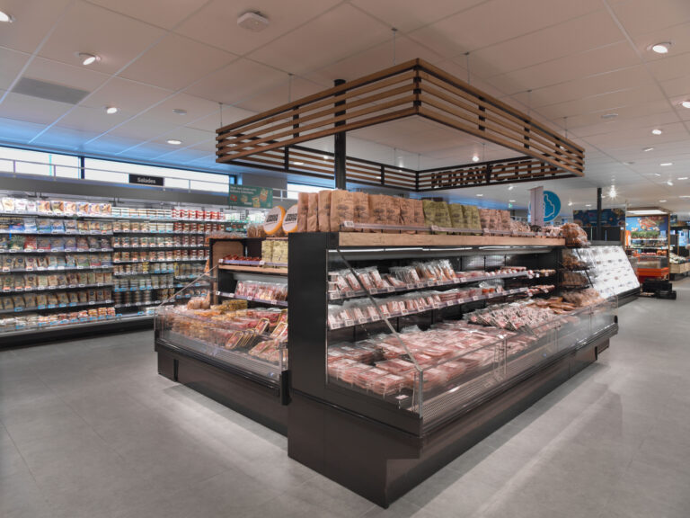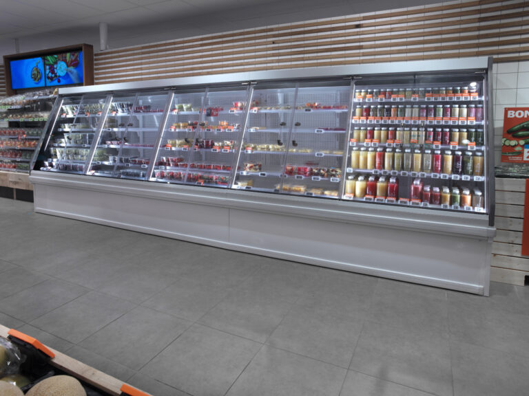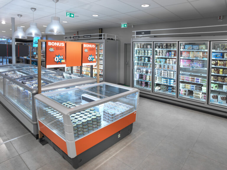 De oude koelinstallatie, die werkte met een combinatie van FREON en CO2 als koudemiddel, vervingen we door een koel- en vriesinstallatie die voor de volle 100 procent draait op het natuurlijke koudemiddel CO2. Deze efficiënte koelmotor stuurt centraal en bedrijfszeker alle nieuwe koel- en vriesmeubels aan waarmee de supermarkt werd ingericht. Al die meubels krijgen hun koeling via alle nieuwe leidingbanen die we in de winkel aanlegden.