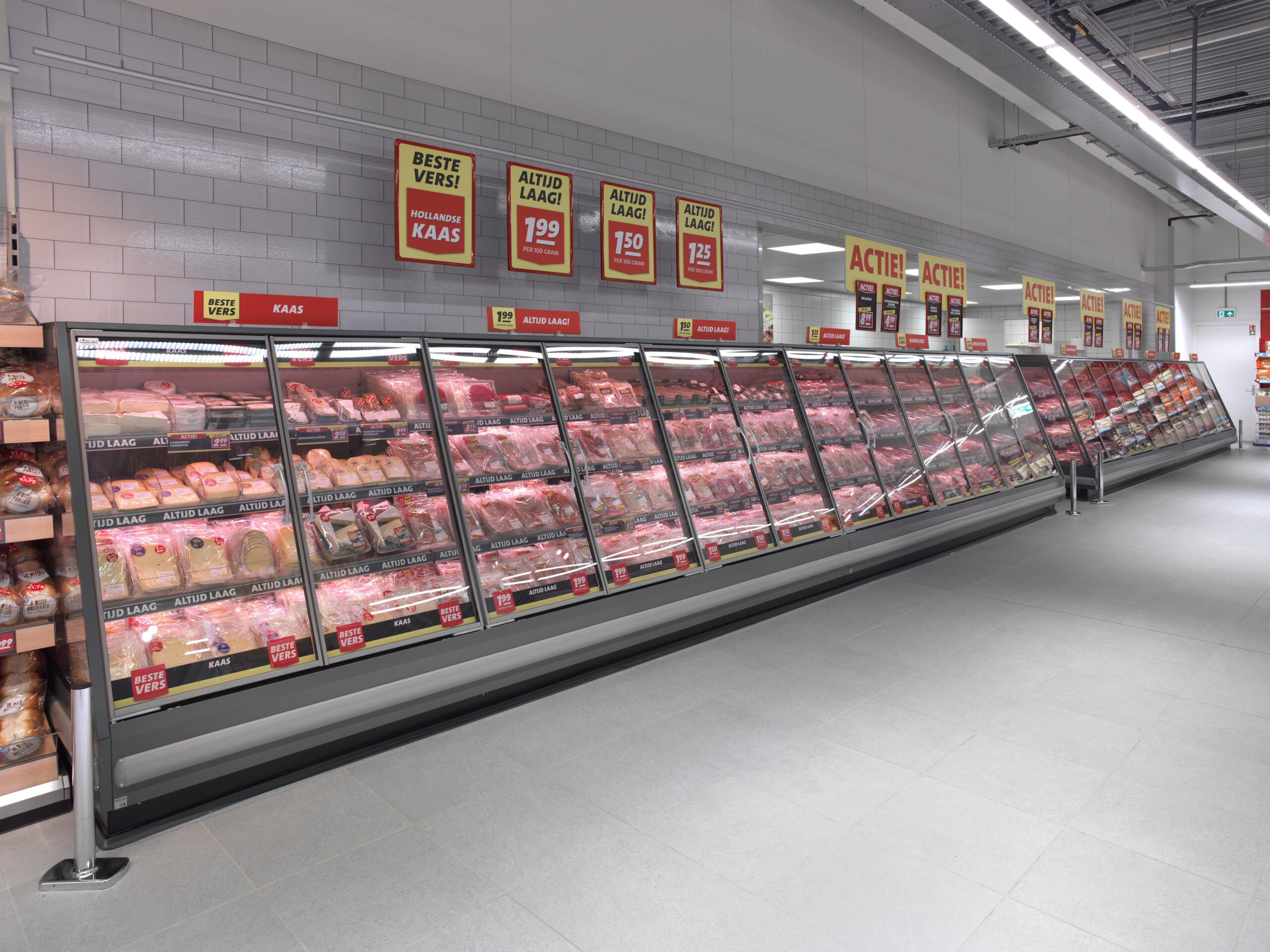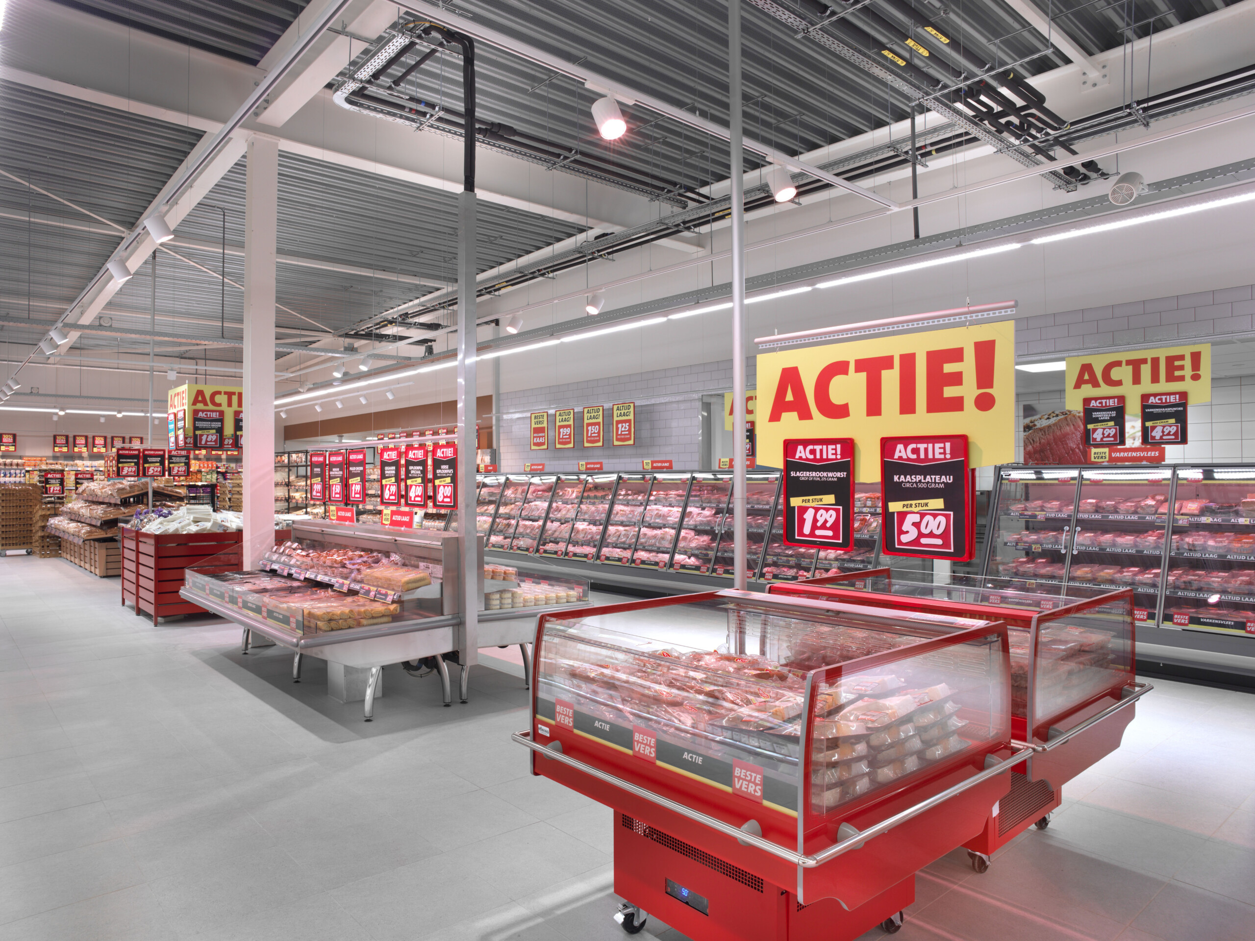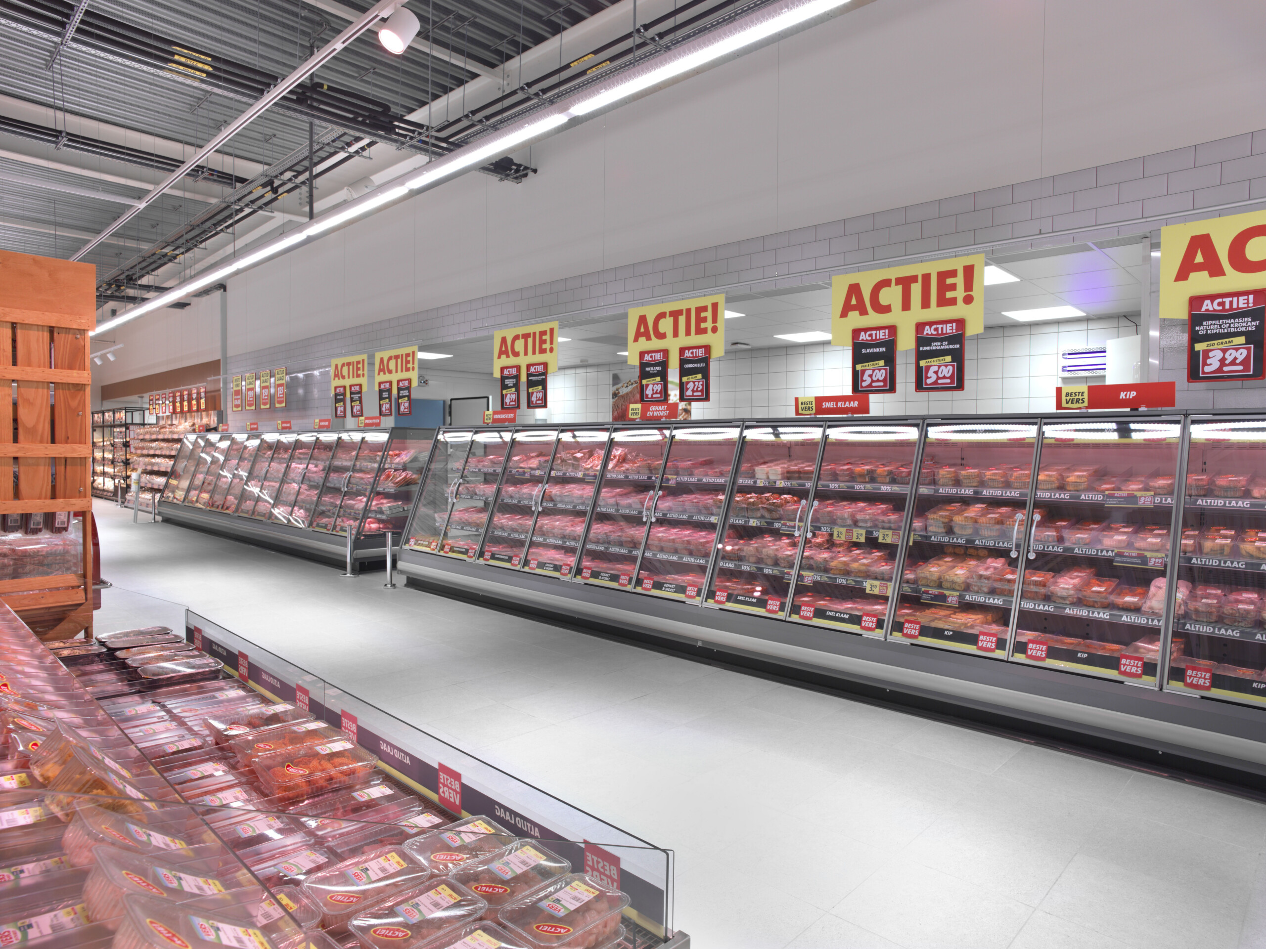 De winkelvloer wordt gesierd door duurzame koelmeubels uit onze eigen lijn, met onder meer energiebesparende dagafdekking en led-verlichting. De slagerijafdeling gaven we ruimtekoeling voor de werkplaatsen en een extra koelcel.
