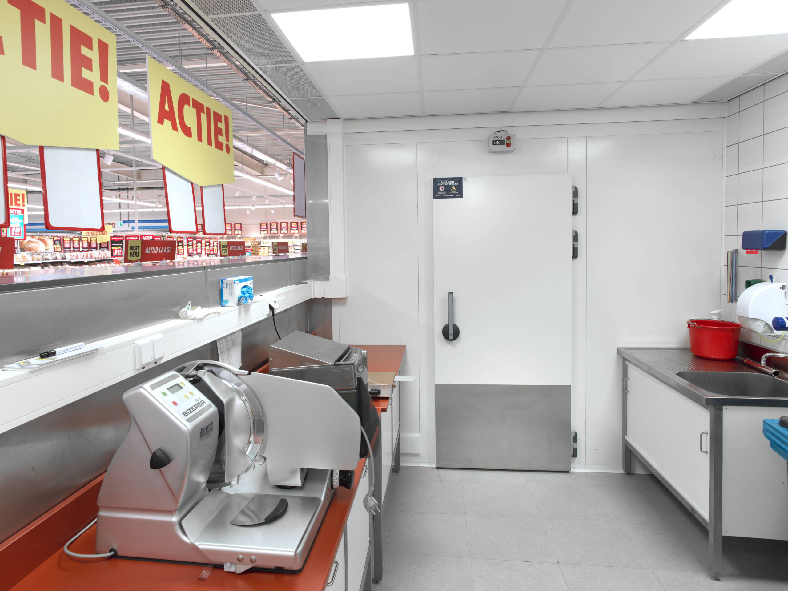Koeltechnische winkelinrichting met energiezuinige koel- en vriesmeubels en ruime slagerij-afdeling. Ook nieuwe koel- en vriescellen in het magazijn.