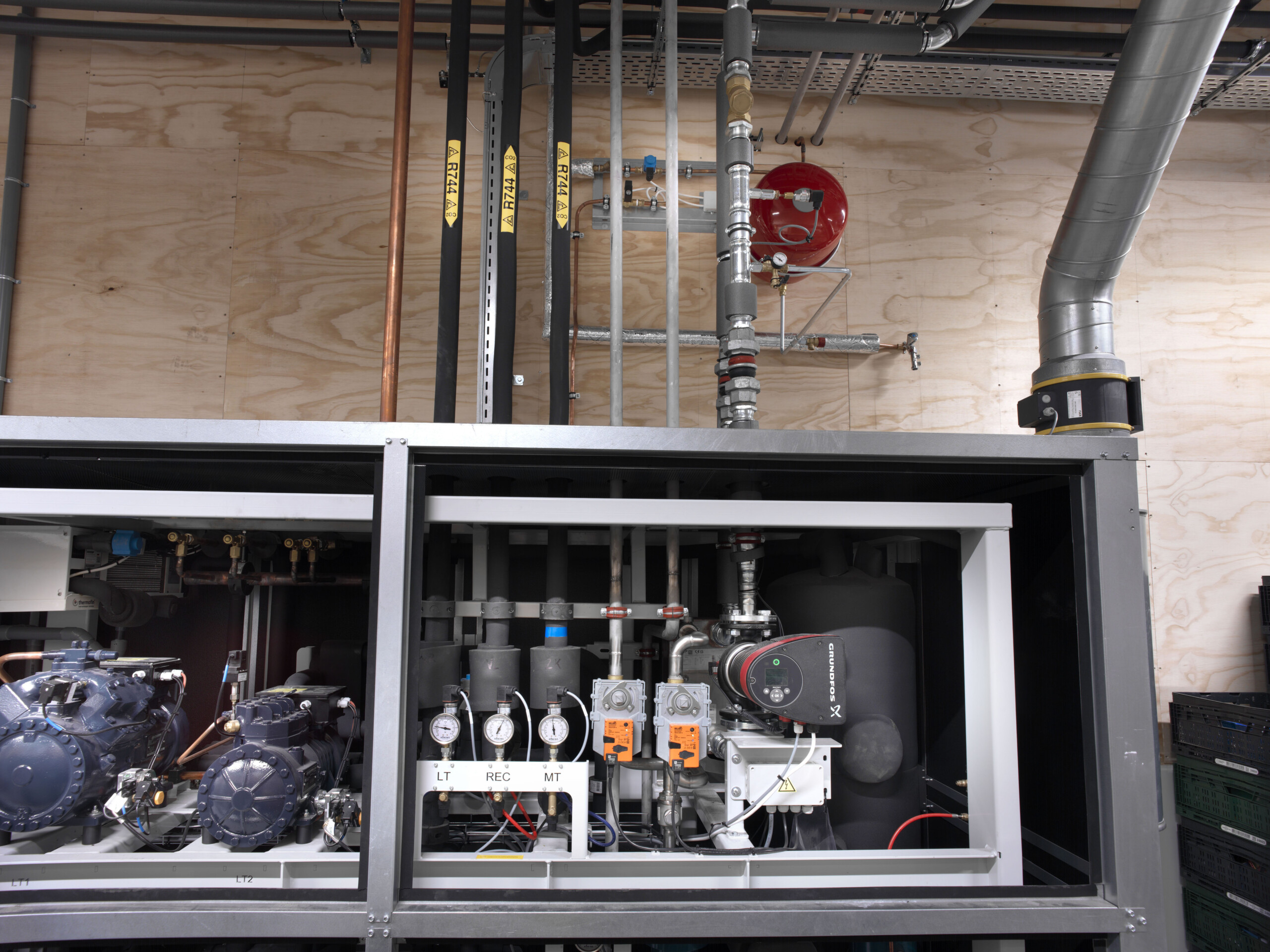 Deze koelmachine is ook de centrale motor van de verwarming in het nieuwbouwpand. Dankzij restwarmte uit het koelproces kunnen we de winkelruimte volledig en gasloos verwarmen. Warmtepompen voor de kantoren en de kantine én gezonde winkelventilatie maken ons klimaatsysteem duurzaam af.