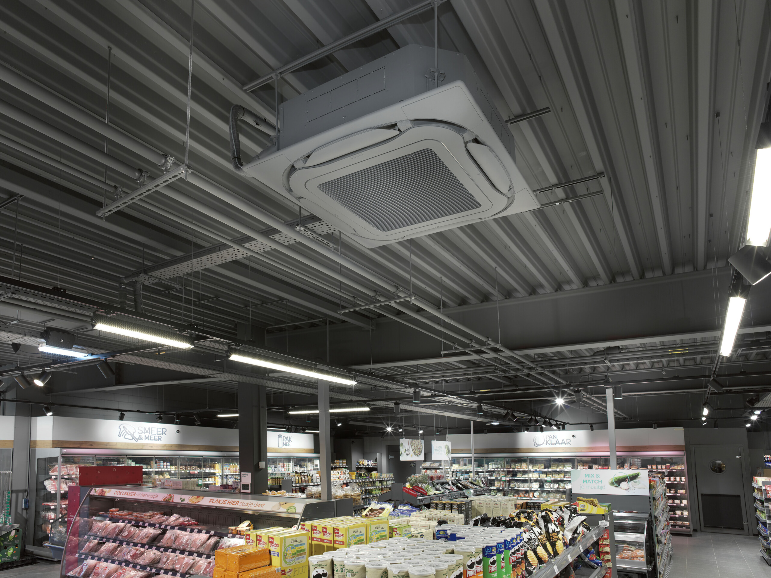 De CO2 koelinstallatie rustten we bovendien uit met warmteterugwinning (wtw). Dankzij die wtw wordt de gegeneerdere koelwarmte slim en energiezuinig ingezet voor verwarming van de winkel, de kantine én de kantoorruimtes. Met energievriendelijke airco’s maakten we het klimaatsysteem af. En dankzij de nieuwe koelcel en vriescel die we vanuit Koning Koudetechniek in het magazijn opbouwden is de winkelvoorraad altijd op orde.